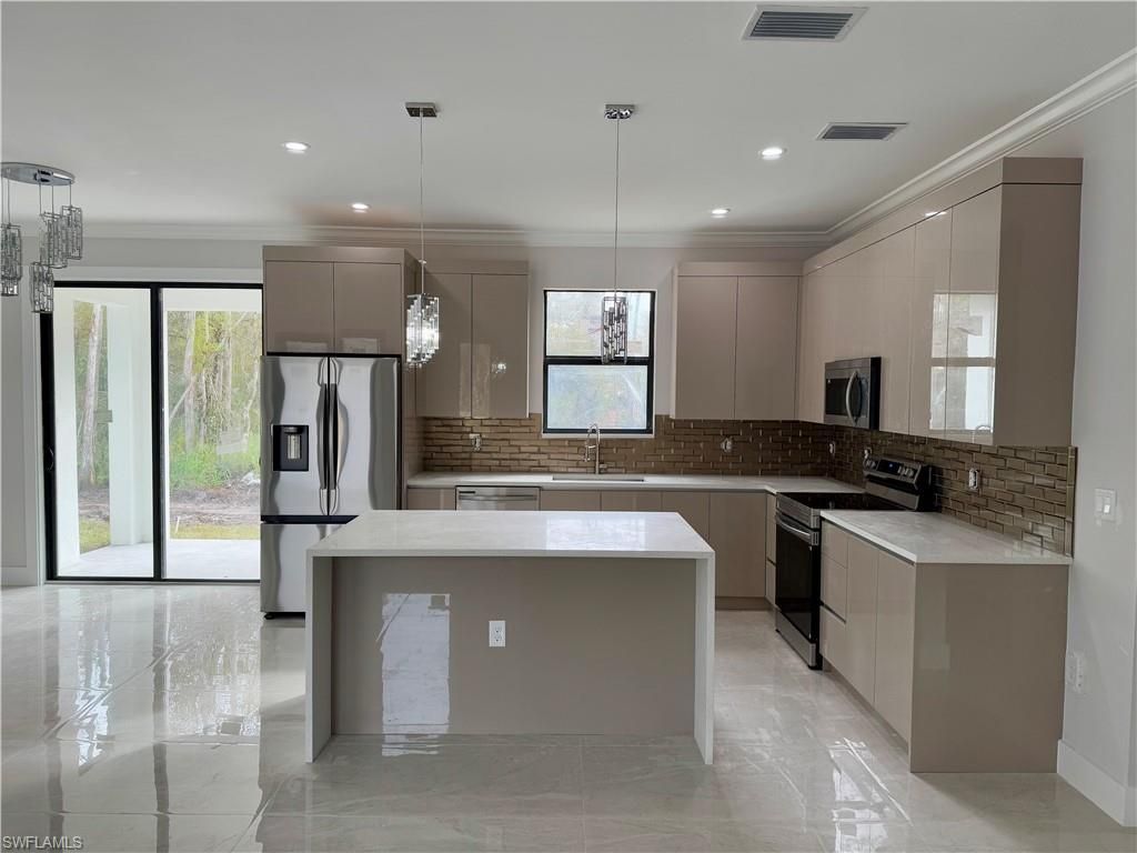 Gorgeous, 3 bedroom PLUS den, NEW CONSTRUCTION situated on a private, wooded 1.14 acre lot! This property offers amazing privacy (NO neighbors on either side!), a peaceful and gorgeous surrounding with Florida nature displayed at its best. As you enter the house, you will notice the great attention to details and high quality, such as tall french doors, a lovely and modern living room with tile throughout the house, a fresh modern kitchen with all CUSTOM cabinets, quartz countertop, a waterfall island, and soaring high tray ceilings, crown molding on main living area and master bedroom, 6" baseboards throughout, 8-ft doors, and beautiful, modern bathrooms featuring vessel sinks and custom cabinetry. Located in the rapidly growing Golden Gate Estates area, just a short driving distance from supermarkets, coffee shop, pharmacy, gas stations, and the impressive, new 150 acre regional water park, and great Naples public schools makes this home the perfect investment for your family! ACTUAL PROPERTY FEATURES THE BROWN CABINETS. SELLER WILL CONTRIBUTE WITH $10,000 TOWARDS BUYER'S CLOSING COSTS AND PREPAID.